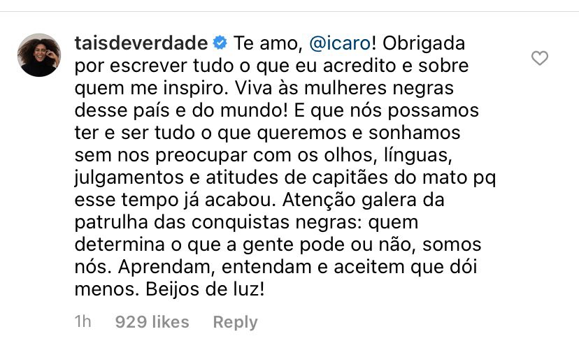 Entre o apoio de muitos artistas nos comentários da postagem, Taís Araújo – que dias atrás chegou a reproduzir a foto icônica ao lado do marido, Lázaro Ramos – foi uma das que não apenas aclamou o colega, como ainda declarou: “Viva as mulheres negras desse país e do mundo! E que nós possamos ter e ser tudo o que queremos e sonhamos, sem nos preocupar com os olhos, línguas, julgamentos e atitudes de ‘capitães do mato’, porque esse tempo já acabou.”