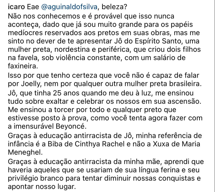 “Você não sabe nada de Joelly, Aguinaldo. Não sabe nada de Jô, nem de Beyoncé. É visível que não. Seu olhar viciado sobre a sociedade brasileira, expresso em novelas ainda hoje tão embranquecidas, não contempla nossa história, tampouco nosso tamanho. Eu quero Beyoncé carregada de diamantes, Aguinaldo. Quero vê-la coberta da cabeça aos pés das pedras mais preciosas já roubadas do continente africano pelos europeus. Quero ver Beyoncé nadando em um cofre de diamantes como se fosse tio Patinhas, quero ter que usar óculos escuros pra ver Beyoncé. E o dobro eu desejo para toda e qualquer mulher preta nesse planeta! Beyoncé é o presente e cada vez mais o futuro, Aguinaldo. A Elite Preta que o racismo te impede de sequer reconhecer e que torna obsoleta qualquer representação falha proveniente da ignorância racista”, concluiu.