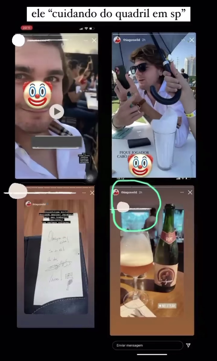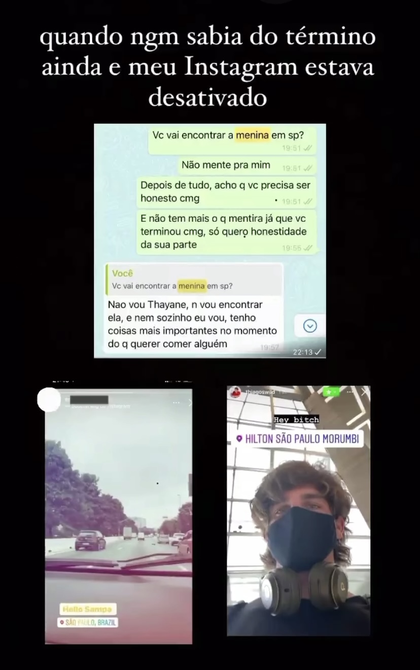 Mesmo assim, Thayane ainda pensou em dar uma segunda chance para o relacionamento, mas com a recusa do rapaz, viu o perdão se transformar em frustração. “Ele me traiu e eu não tive nem a opção de decidir se eu ia perdoar”, contou, ao revelar que, enquanto ela estava em casa, desolada, ele voltou a se encontrar com as mulheres com quem a traiu e a sair para baladas, tudo devidamente compartilhado nos stories, como se nada estivesse acontecendo.